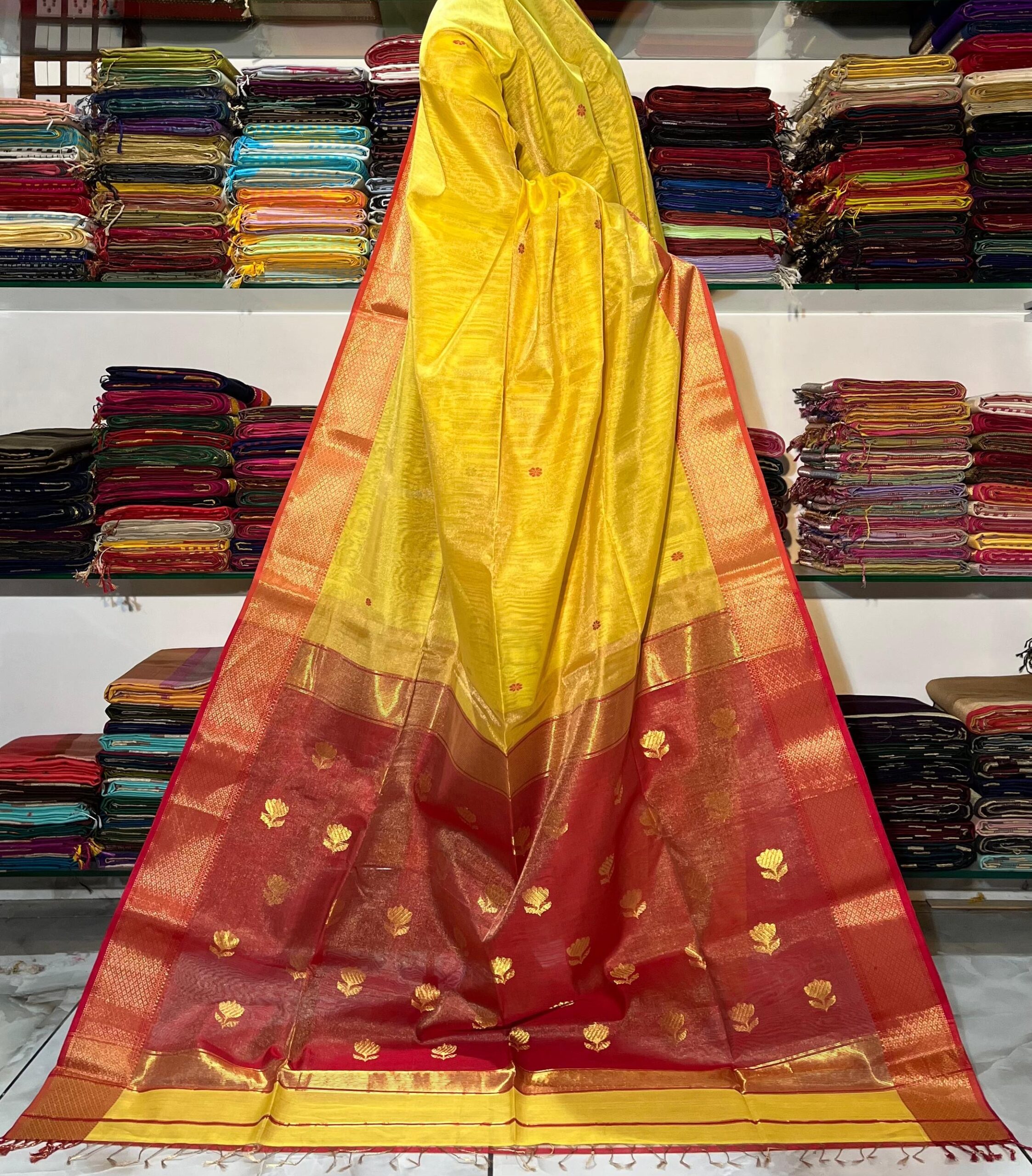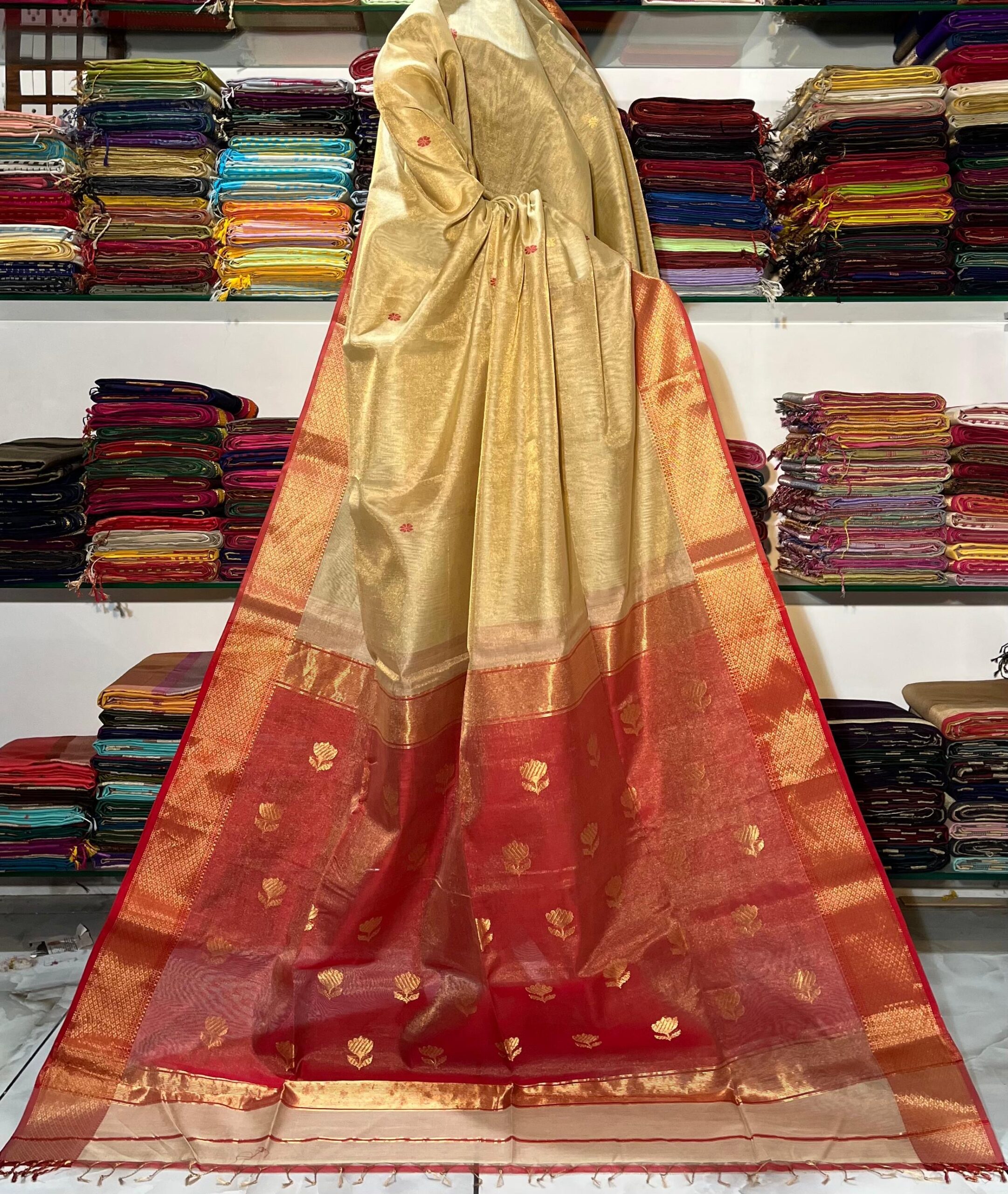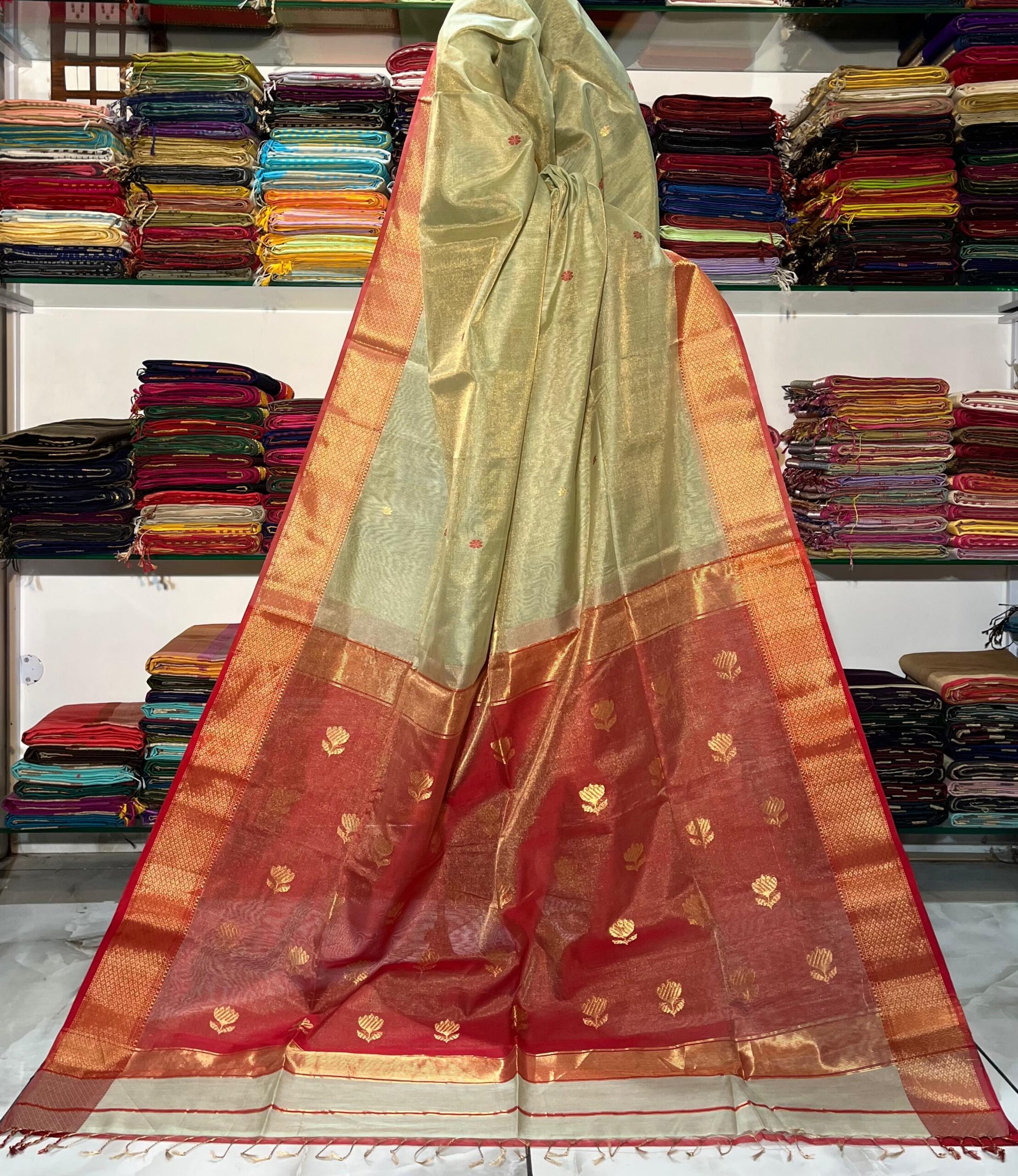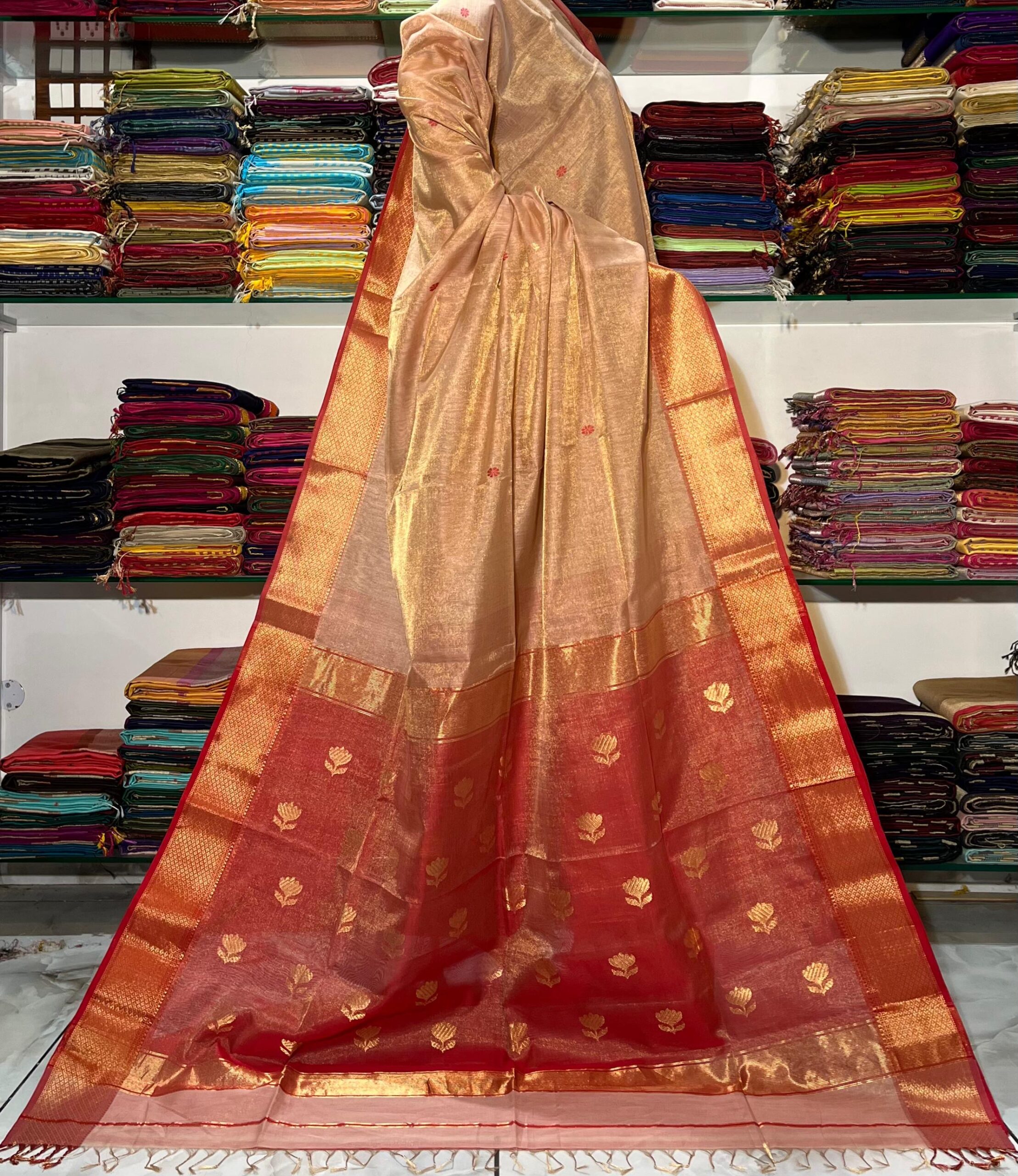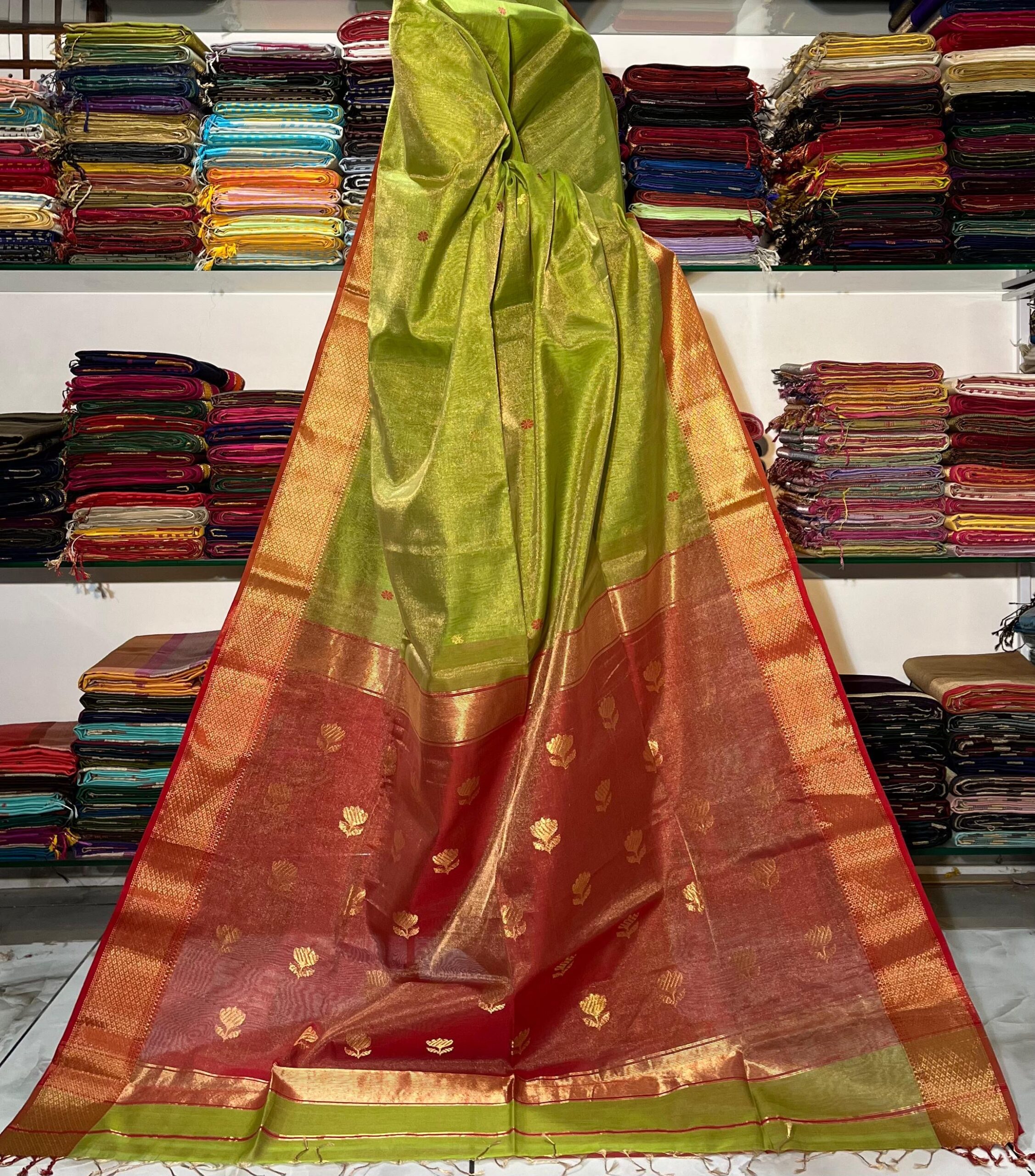 / Maheshwari Tissue Lotus Pallu Buta Saree